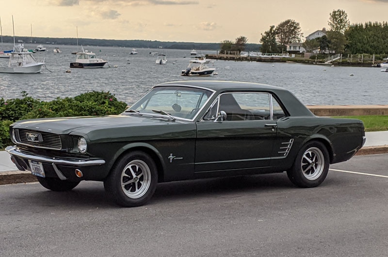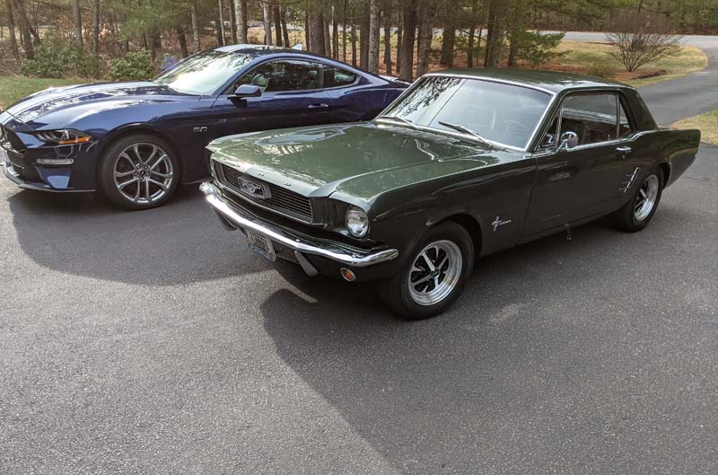 “I was able to come up and speak with John Clor very briefly after the podcast recording session and told him my first Mustang was a 1975 Mustang II (knowing he’s a big fan of second-generation Mustangs). I have owned several Mustangs over the years but currently have a 1966 Coupe in Ivy Green with an inline 6-cylinder, and a 2020 GT in Kona Blue with white stripes. My wife and I cruise in the ‘66 during the summer and it winters in our garage in Rhode Island. Those New England Mustangs take a beating so she’s earned her winter respite. People often ask why I don’t put a V8 in it, and I tell them if I want to go fast I have the 2020 GT with traction control, air bags, etc. I’m keeping the ’66 the way it is; it’s a very different driving experience!