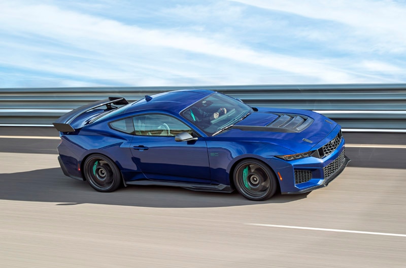 The Mustang Dark Horse SC with Track Pack adds Brembo carbon-ceramic brakes, Michelin Pilot Sport Cup 2 R tires, Rear Seat Delete, and 20” carbon-fiber wheels — about a 150-lb. weight reduction.