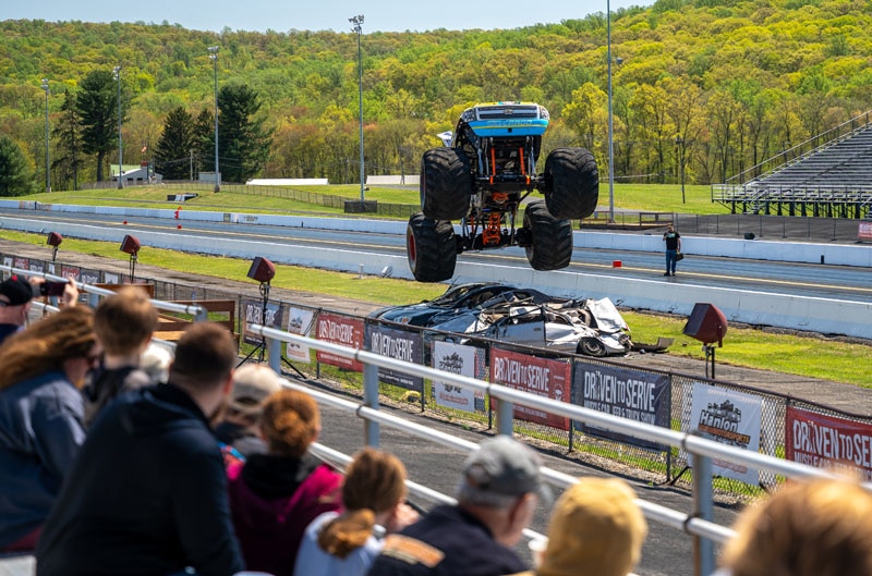 Following the truck unveiling, the jet cars ran made another pass down the strip since most of the people in attendance were already seated in the stands. The jet cars are a drag racing fan favorite, rocketing down the track and completing their quarter-mile run in just over 5 seconds at 285 mph! These cars got the crowd fired up just in time for the monster truck demonstration. There’s really nothing like seeing these colorful trucks perform, packing thousands of horsepower and standing tall on some massive 66-inch high, 43-inch-wide tires. Needless to say, it wasn’t all sunshine and rainbows for the poor cars being crushed by the monster trucks. If you didn’t understand the word “destruction” before the demonstration, you certainly did after!