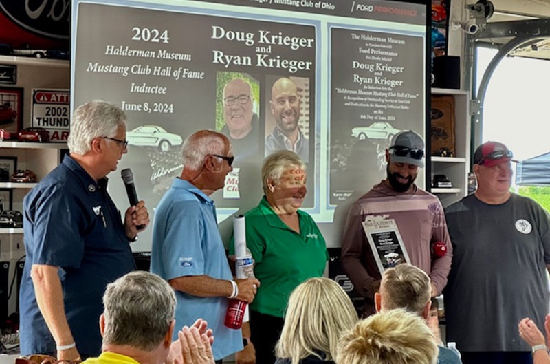 Last spring, the West Michigan Mustang Club (WMMC) decided to nominate longtime club principal Rick Bishop for the award. But in June, the Mustang Club of Ohio (MCO) had an unique request approved, nominating two club members from the same family for co-induction into the hall. They were Doug Krieger and his son, Ryan Krieger. If that name sounds familiar, it’s because they are the owners of Krieger Ford in Columbus, which has been a supporter of the MCO since its inception, thanks to the strong relationship Doug had with the club. Son Ryan continued that partnership (which includes sponsoring the MCO’s big annual Mustang and Ford car show and hosting it at the dealership each summer) ever since Doug turned the dealership reins to Ryan. The club enjoyed a huge turnout on Hall of Fame award day at the museum to honor both Doug and Ryan for the Kriegers’ longstanding bond with the Mustang Club of Ohio. Member cars filled the museum’s lawn (check out the club’s own aerial drone shot!) and more than a few cars at the cruise-in won recognition awards.