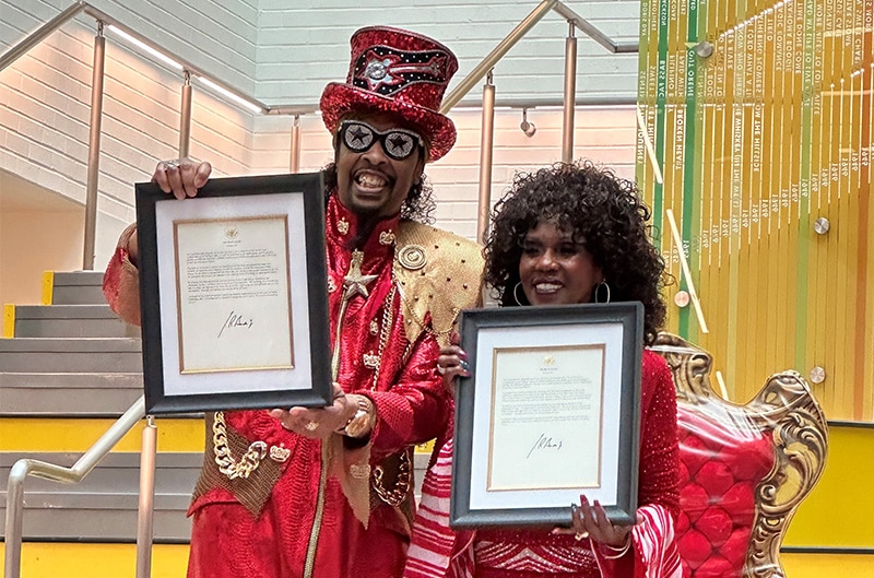 That’s because it’s time for us to turn the spotlight on Bootsy and Patti Collins, who have both been honored with Presidential Lifetime Achievement Gold Medal Awards! Bootsy is a Rock and Roll Hall of Fame funk musician and actor, and his wife Patti is the president of the Bootsy Collins Foundation, which has spearheaded national “Funk Not Fight Movement” tour to raise awareness about violence and address it through music.