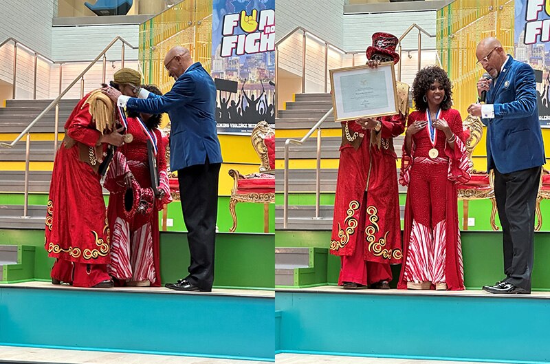“Of course the highlight of the day came when Dr. Kenneth W. Curry from the Office of the President presented both Bootsy and Patti with the Presidential Lifetime Achievement Gold Level Medal Award, with Bill Montgomery of Hidden Pioneers looking on. They received this award in honor of their tireless efforts to spread their message of hope and love through their music and youth outreach.”