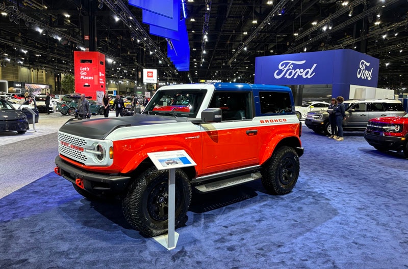 Retro Bronco fans would be delighted to see a new package for 2025. Dressed in black with a tricolor burst of sunset hues was the Free Wheeling appearance package. Being a huge fan of the 1978-79 F-150 and Bronco sunset theme, I think this is an awesome way to relive those same late-70’s vibes while taking advantage of the latest off-road technology. Right next to the Free Wheeling Bronco was the 2025 Ford Bronco Stroppe Special Edition. This new Bronco package honors the Original Baja 1000-winning Bronco from the 1960’s and 70’s. The Bronco Stroppe Special Edition includes Fox Internal Bypass Dampers that are designed for performance and improved control during high-speed desert running. Power comes from a standard EcoBoost 2.7-liter V6 engine that includes Baja G.O.A.T. Mode.