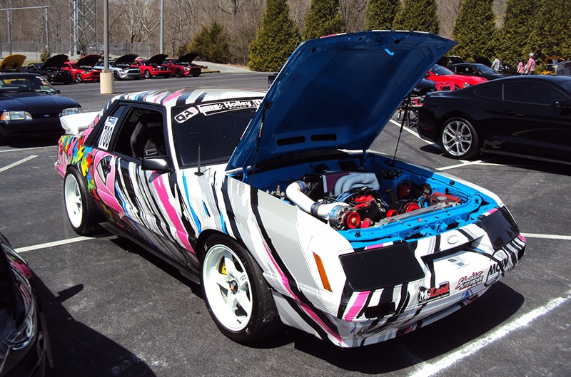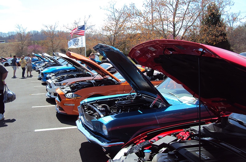 Of course, Club Connect was there primarily for the big car show on Friday that was staged at the Sevierville Convention Center from 8 a.m. until 4 p.m. With so many people stopping by to get a free Mustang poster and Ford Performance wristband (this year’s color is Brittany Blue!), we barely found time to check out all of the specialty displays inside, not to mention the hundreds upon hundreds of Mustangs that filled both paved lots flanking the convention center as the KOTS Show-and-Shine judging was taking place. Friday was a partly sunny day with the temp pushing 80 – perfect for a season opener! The nice thing about closing the show at 4 o’clock was that it gave everyone plenty of time to head back to the variety of hotels in town to freshen up before venturing out to dinner at any of the myriad of restaurants that this tourist area has to offer.