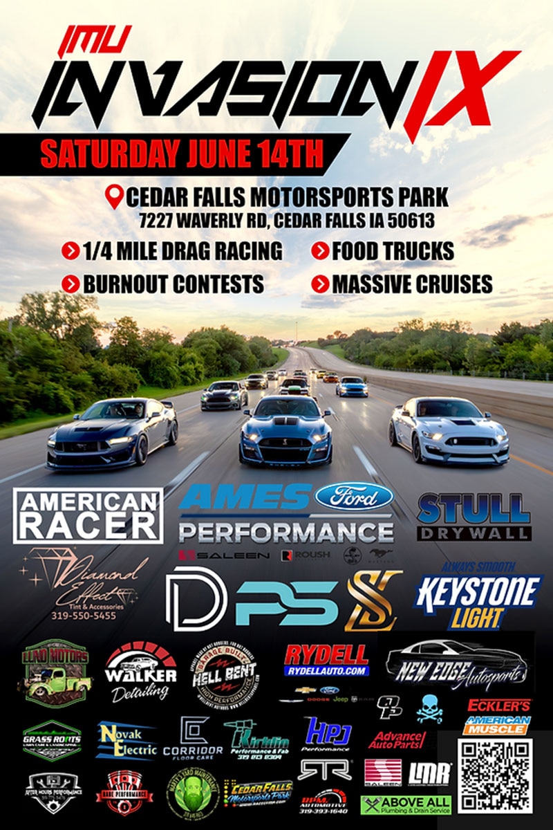 Can’t make it to Carlisle? Here’s another option for you: Iowa Mustangs Unstabled is hosting its 9th Annual “Stang Invasion” on June 13 through 15, with some 700 Mustangs or more expected to roll in for one of the country’s largest Mustang-only events. Various Mustang meet-ups are scheduled across Iowa for a cruise to the big show at the Cedar Falls Motorsports Park. There, “Invasion IX” will feature food trucks, music, a burnout contest, a raffle and drag racing all day and night, plus the Show & Shine on Sunday with awards. Our Ford Special Vehicle Registry team is looking to make a repeat appearance, so make sure you come and check out what this new Ford program is all about. Stang Invasion is a non-traditional, run-what-you-brung gathering that’s family friendly and full of young Mustangers new to the hobby -- so come and experience what the Mustang shows of the future are like. To get info on how you can catch all the action, check out the Mustangs Unstabled website here: STANG INVASION | IMU
