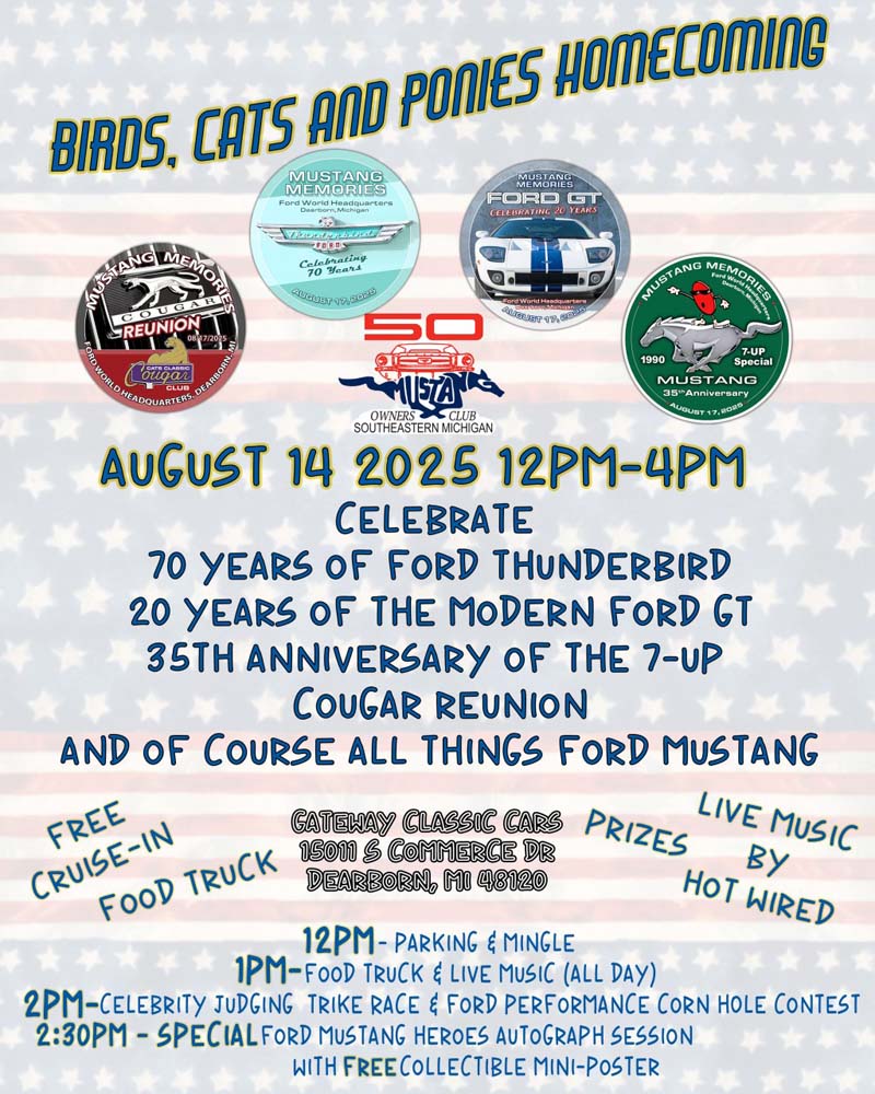 So we’re officially announcing the “Birds, Cats & Ponies Homecoming” hosted by Ford Performance Club Connect and the Mustang Owners Club of SouthEastern Michigan at the back lot of the Gateway Classic Cars showroom, 15011 Commerce Drive South (at Rotunda) in Dearborn on Thursday August 14. Come celebrate with your Thunderbird, Cougar, Ford GT and 7-Up Mustang – plus any sort of Mustang, whether you’re from across town or across the country. We expect about 300-plus cars from more than seven regional Ford clubs for this special show-and-shine, with LIVE music by “Hot Wired,” a great food truck and a Gateway Classic Car Showroom tour, as well as games (including a popular club member Trike Race), plus prizes and an INCREDIBLE Celebrity Autograph Session featuring retired Ford VP Ken Dabrowski and several other past & present Ford execs, engineers, designers and marketers. The event is FREE for participants and spectators alike and runs from 12 noon to 4 p.m. on the 14th (See www.MOCSEM.com for details – and DON’T MISS IT!)