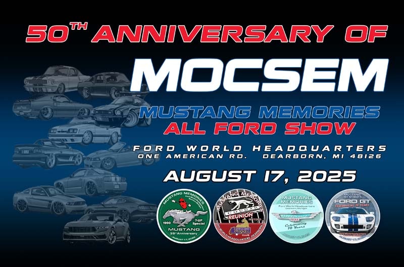If you've been waiting for that one, extra-special enthusiast event to attend this summer, this is it: The annual "Mustang Memories All-Ford Show" https://www.mocsem.com/calendar#!event/2025/8/17/mustang-memories-2025 being held on Sunday, August 17, 2025. It’s one of the largest Mustang and Ford shows in the country (600-900 vehicles are expected this year with the mega event held behind Ford World Headquarters), and it’s all hosted by MOCSEM, https://www.mocsem.com one of the biggest Mustang clubs in the USA – all in Ford's own backyard. This summer. MOCSEM is celebrating its 50th year, with special displays featuring the Ford Thunderbird, Ford GT, Mercury Cougar and 7-Up Mustangs – plus an EXCLUSIVE Ford Heritage Collection FREE vehicle tour in the adjacent Ford WHQ Executive Garage that you just have to see.