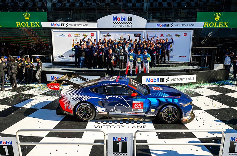 DAYTONA BEACH, Fla., Jan. 26, 2025 – Mustang GT3 triumphed in one of the most rigorous 24-hour endurance racing events in motorsports, the Rolex 24 at Daytona, to score its first global GT3 victory. The No. 65 Ford Multimatic Motorsports Mustang GT3 of Dennis Olsen, Christopher Mies and Frédéric Vervisch earned the landmark victory after holding off a late race challenge in the IMSA WeatherTech SportsCar Championship GTD Pro class. Adding to the Dearborn, Michigan company’s accolades, the No. 64 Ford Mustang GT3 also secured third place for the official factory team with drivers Seb Priaulx, Mike Rockenfeller and Austin Cindric at the road course of Daytona International Speedway.